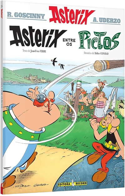Publicação brochurada do famoso Astérix de René Goscinny e Albert Uderzo, com textos de Jean-Yves Ferri e desenhos de Didier Conrad, publicado pela Editora Record